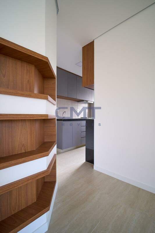 Sala para 2 ambientes com piso em porcelanato, e teto com rebaixamento. Ambiente conta com lavabo com bancada em granito e cuba sobreposta.