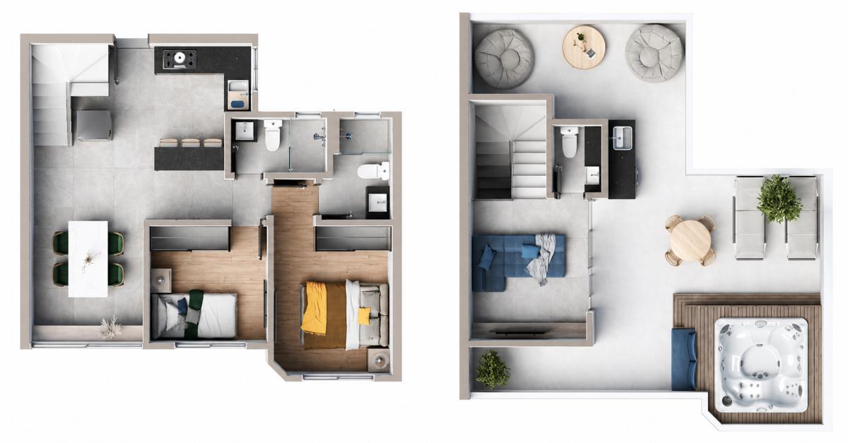 2° pavimento: Sala ambiente, lavabo, terraço descoberto.