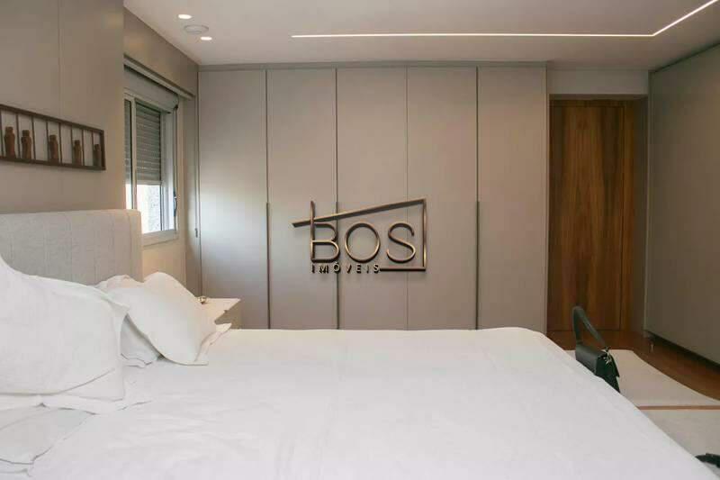 - 01 Quarto amplo com piso em tábua corrida, teto rebaixado e iluminação planejada, sendo a suíte com closet, escritório, rouparia, marcenaria da Cinex, janelas com persianas automatizadas e box em blindex.