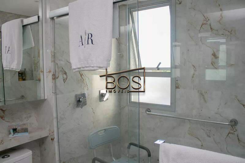 - Cozinha ampla com bancada americana, passa-prato e marcenaria da Cinex, persianas automatizadas e piso em porcelanato italiano.