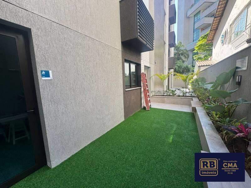 Hall social decorado e jardim frontal