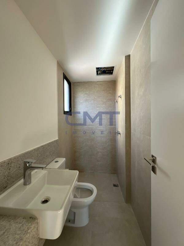 Sala para dois ambientes com rebaixamento de teto, piso em porcelanato, e janelas bastante amplas, proporcionando melhor ventilação e luminosidade natural no interior do ambiente. Ambiente conta também com lavabo com piso em porcelanato e bancada em granito.