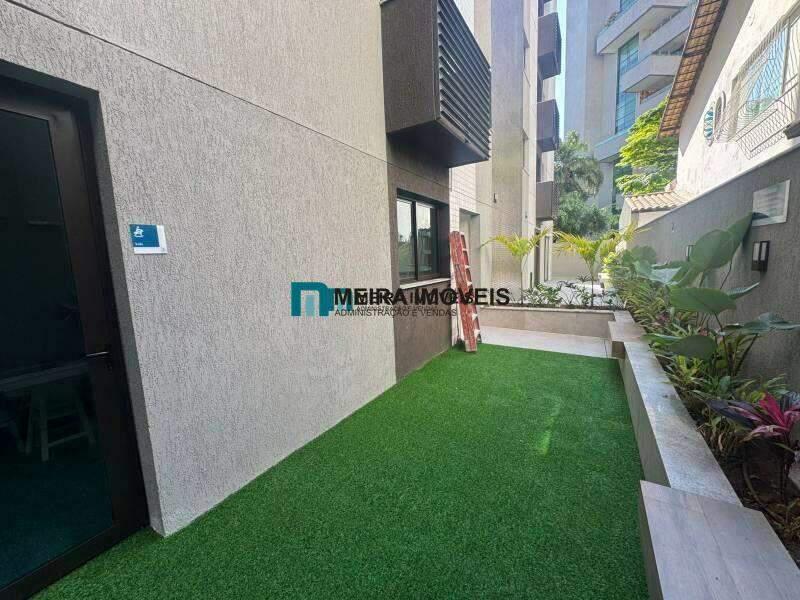 Hall social decorado e jardim frontal