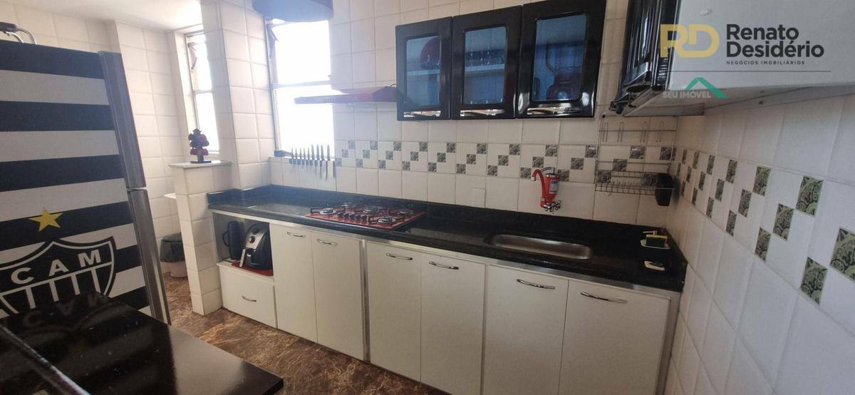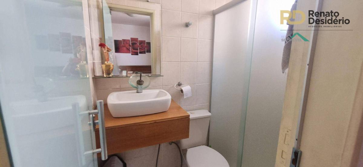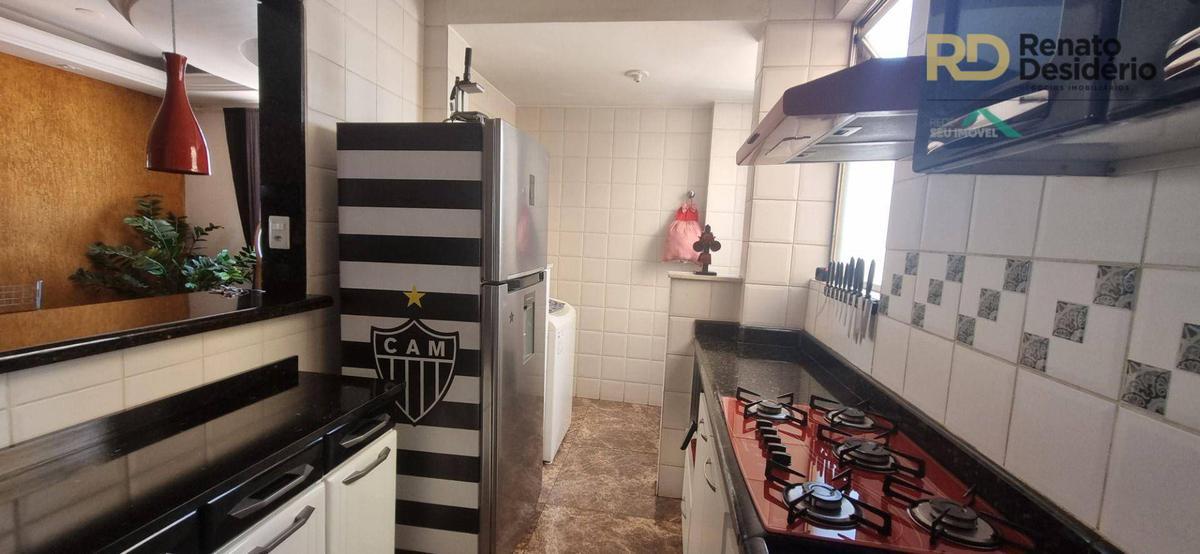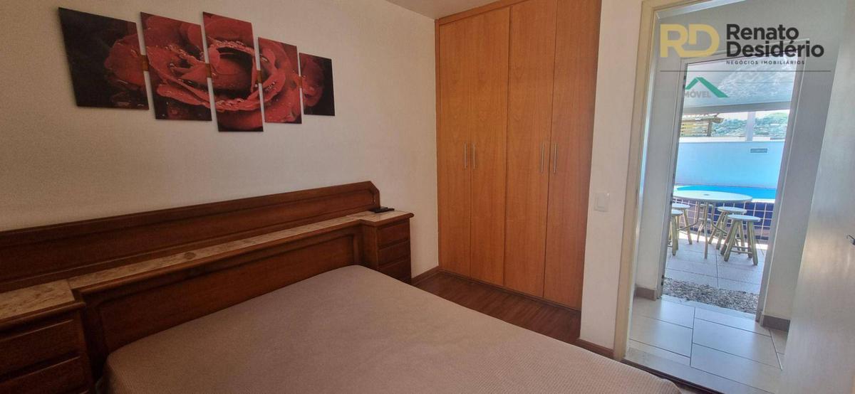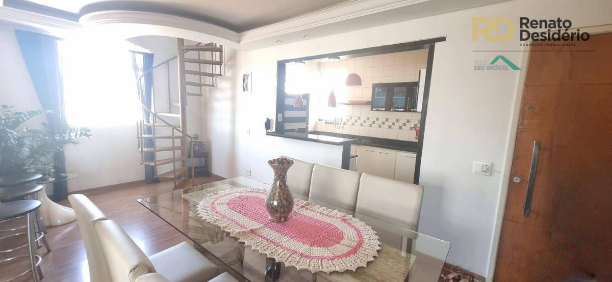 Cobertura possui 2 quartos no primeiro pavimento, 1 suite no segundo pavimento com armários embutidos, 2 banhos com box, cozinha com armários e piso em porcelanato e armários embutidos, bancada e balcão em granito.