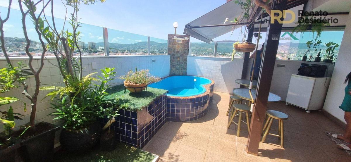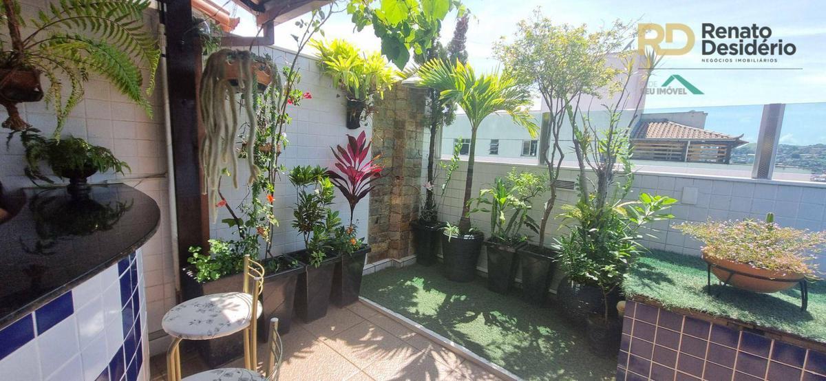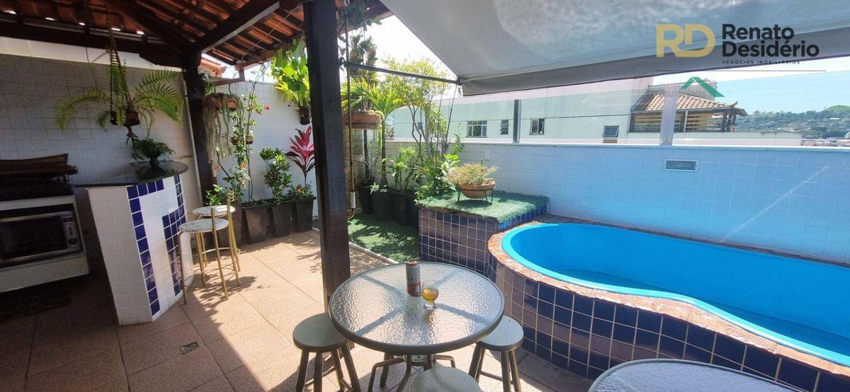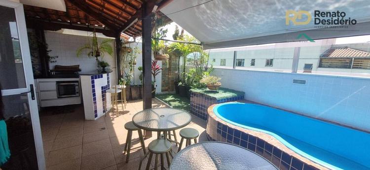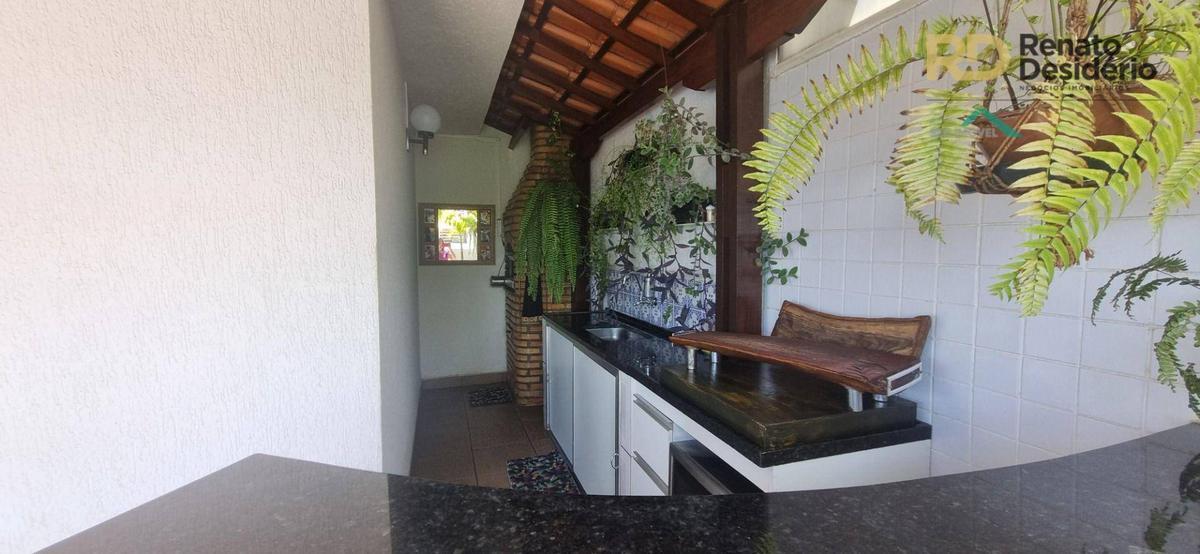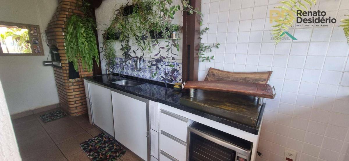 A cobertura está lindamente decorada com bastante vegetação e iluminação planejada. Telhado em telha colonial, piscina com cascata, churrasqueira, balcão em granito, bancada em granito e armários embutidos.
