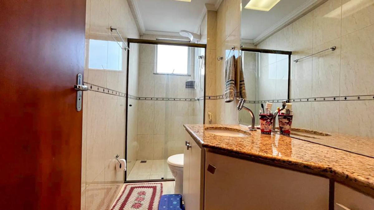 Banho social com piso em cerâmica, bancada em granito com armário e box em blindex.