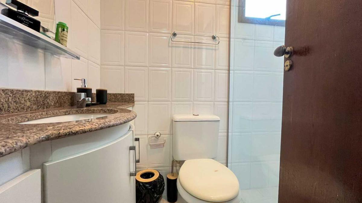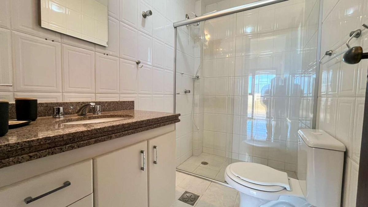 Banheiro social com acabamento em cerâmica, armário, espelho e box em blindex.