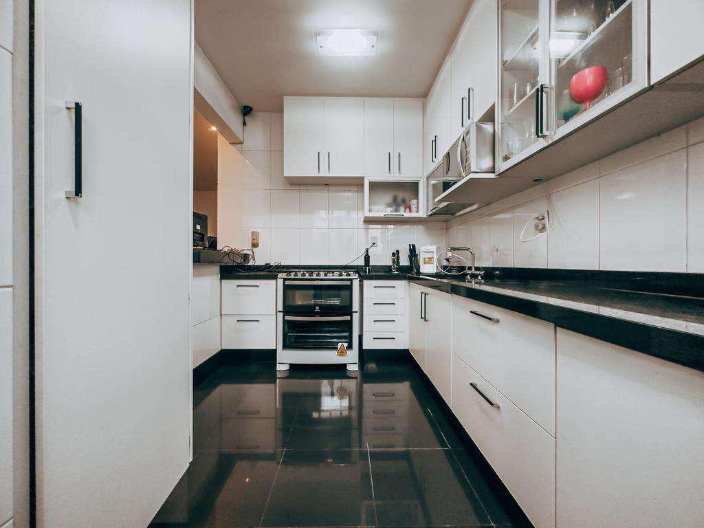 Cozinha americana com armários sob e sobre a pia, piso e bancadas em granito, oferecendo funcionalidade e durabilidade.