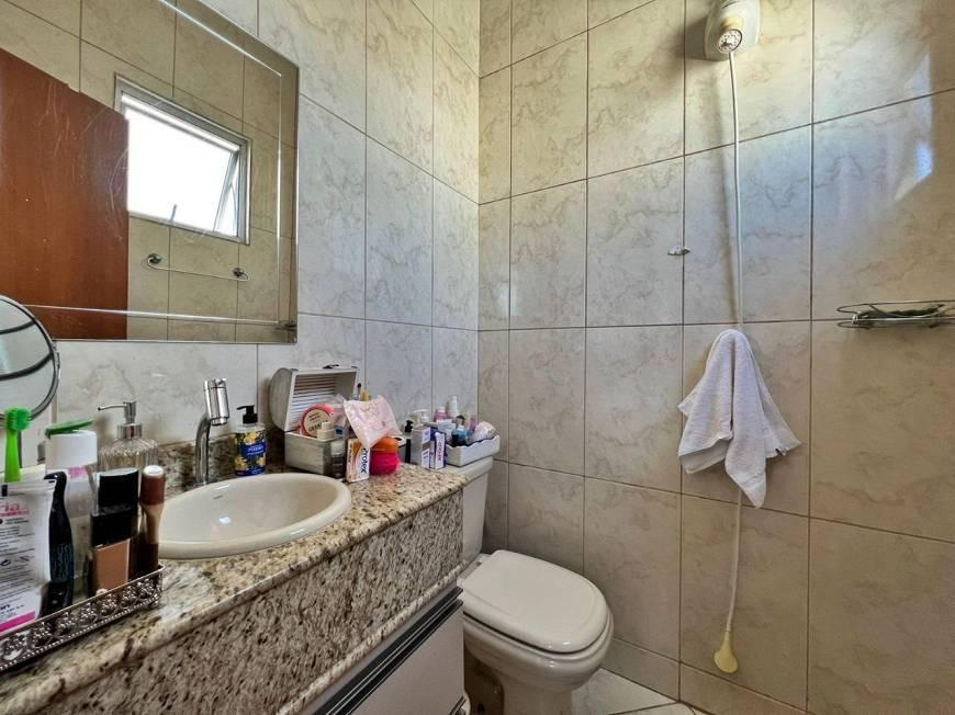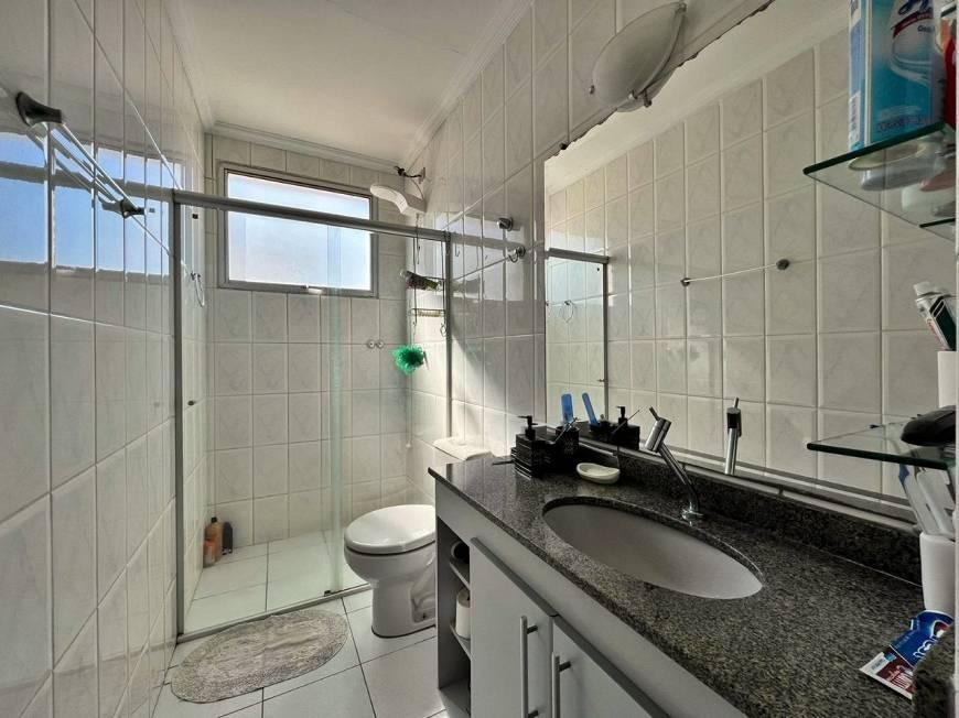 - Banheiro social com bancada em granito e armário.