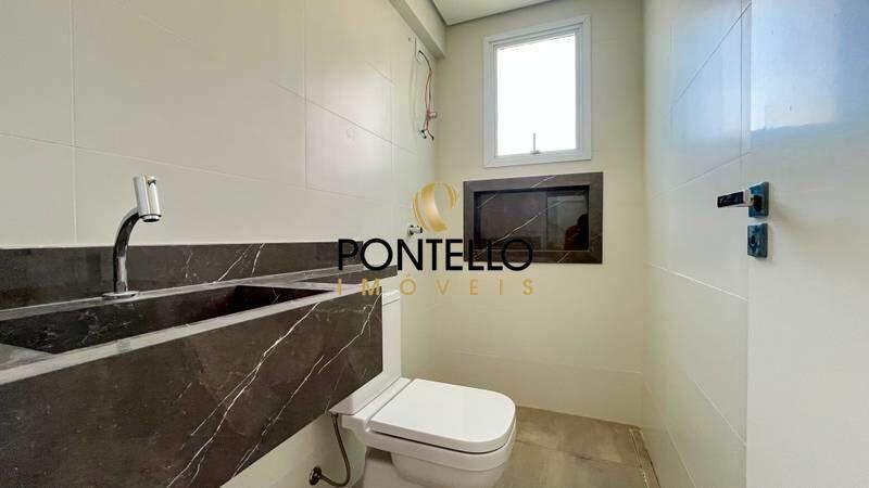 Banheiro social com piso em porcelanato e bancada em granito