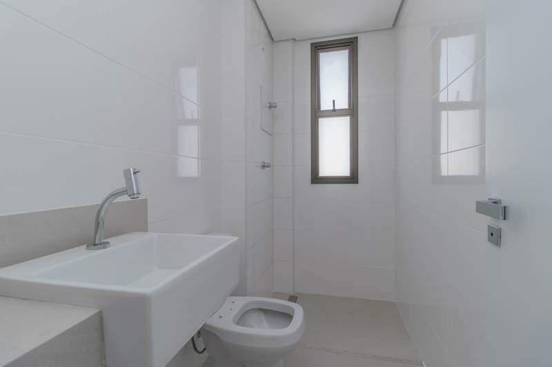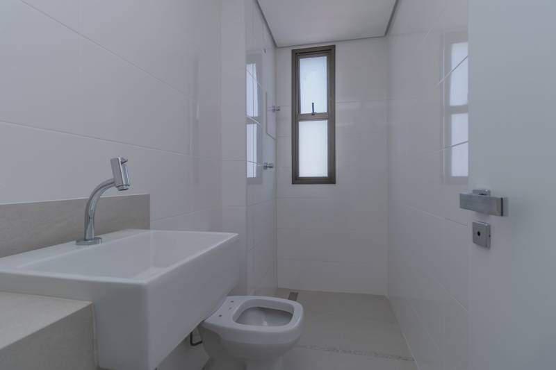 Banheiros (suíte e social) com ventilação natural e acabamento em porcelanato.