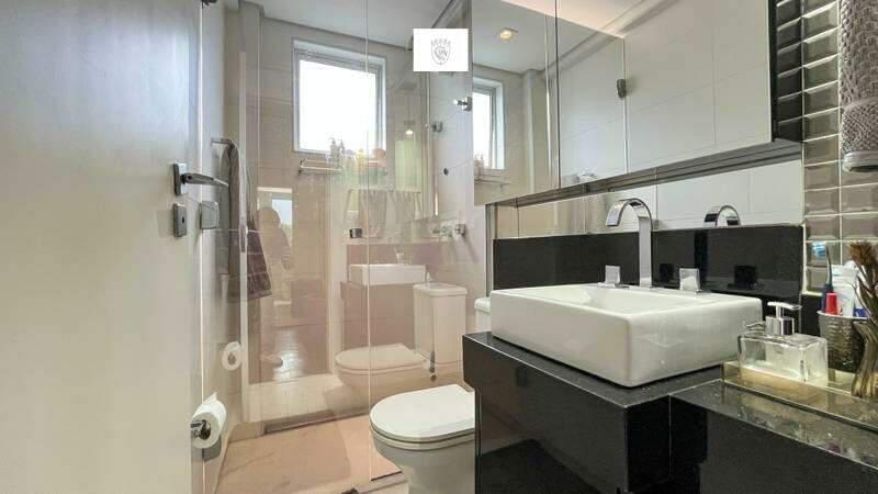 Banheiro social com bancada em granito, pia em cuba espelho, armários planejados e box em blindex