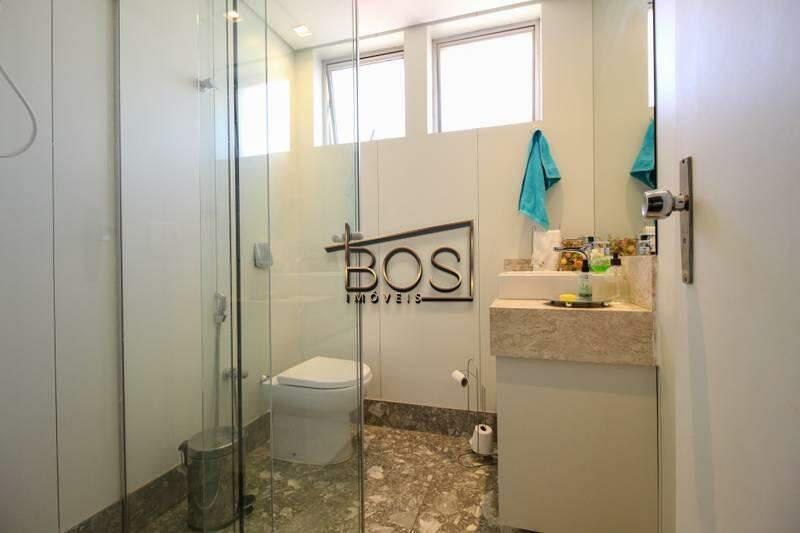 ¿ Banheiros: Banho da suíte e banheiro social com piso em granito, bancadas em mármore, box em vidro temperado, armários e espelhos.