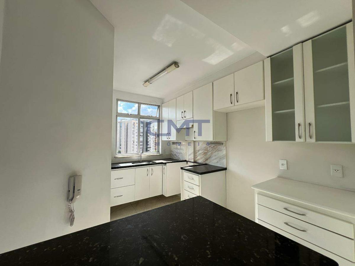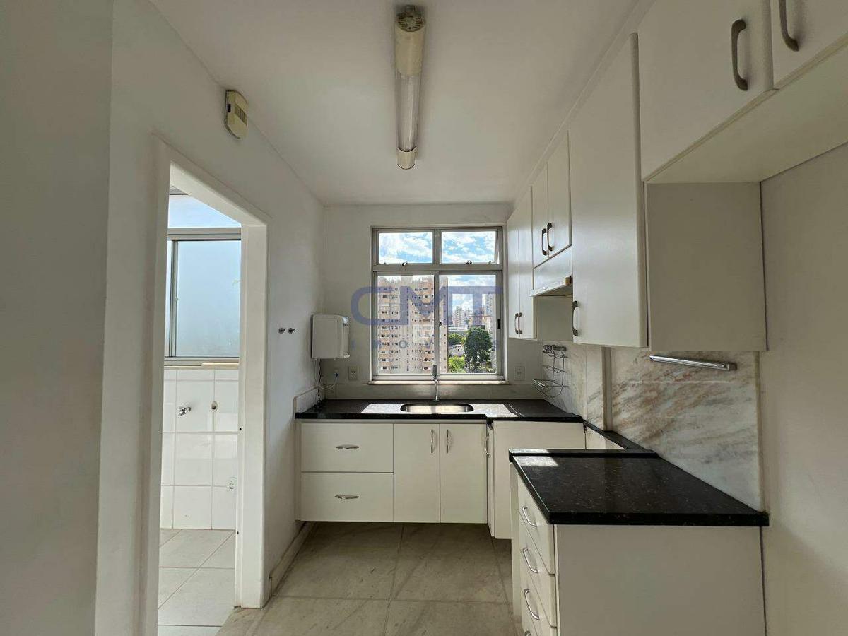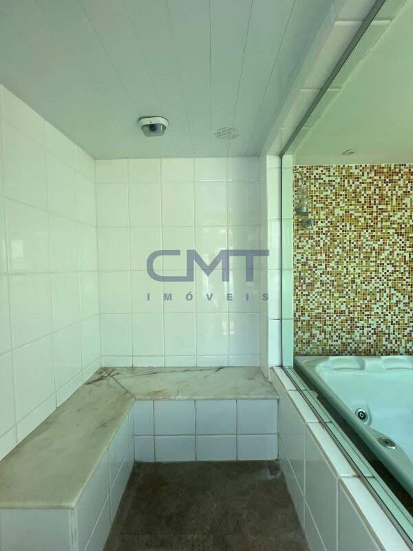 São 3 quartos, sendo um suíte com closet e ar-condicionado; banheiro com piso e bancada em mármore, armário e box blindex.