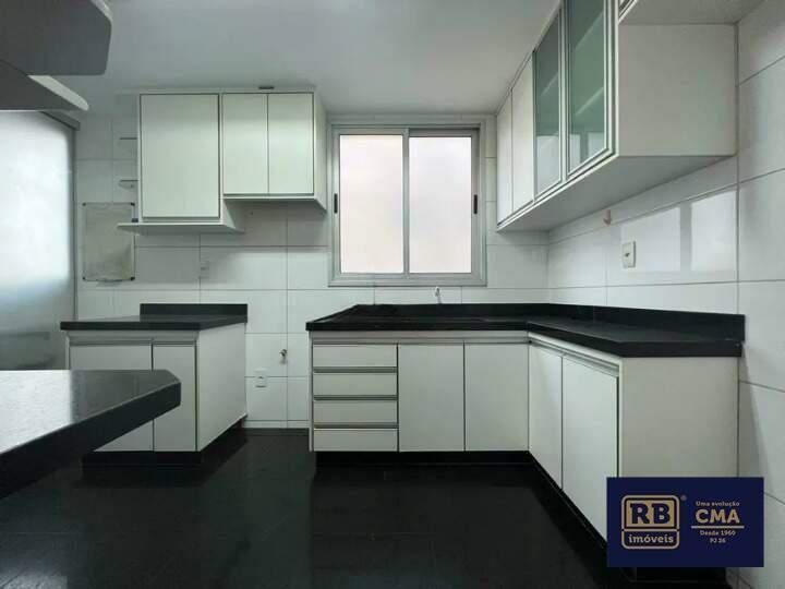 Cozinha espaçosa, com piso e bancadas em granito e muitos armários;