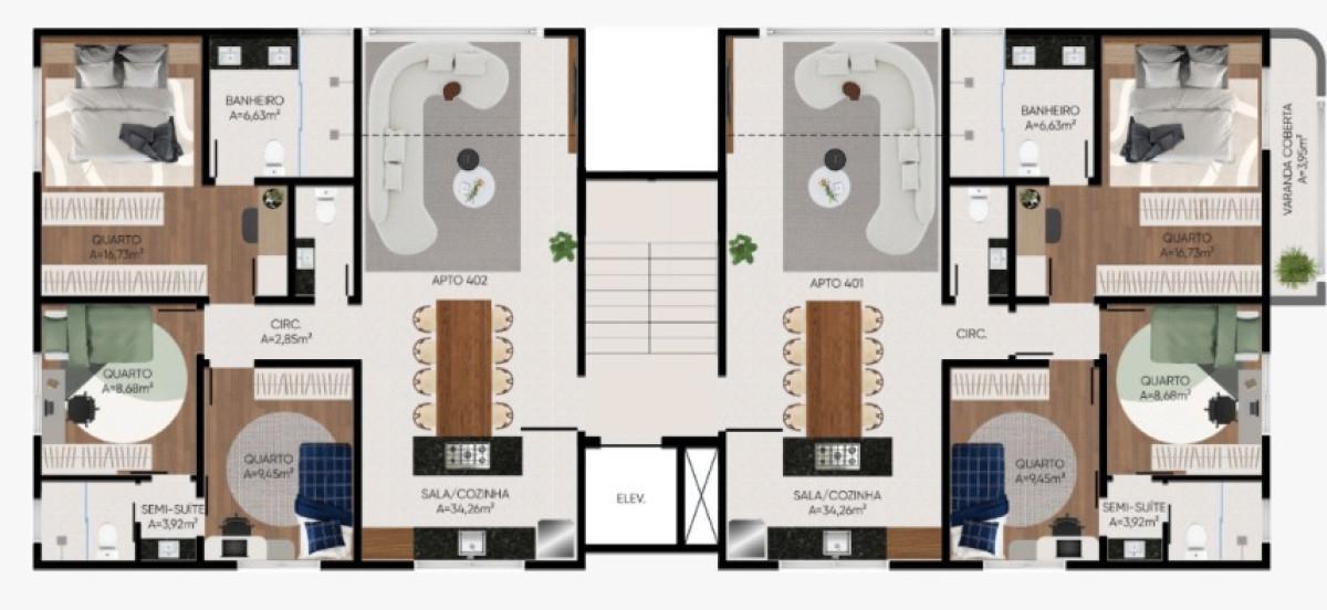 Cobertura com área total de 192,98m², sendo 144m² de área interna, 48,98m² área externa privativa aproximado, sendo: