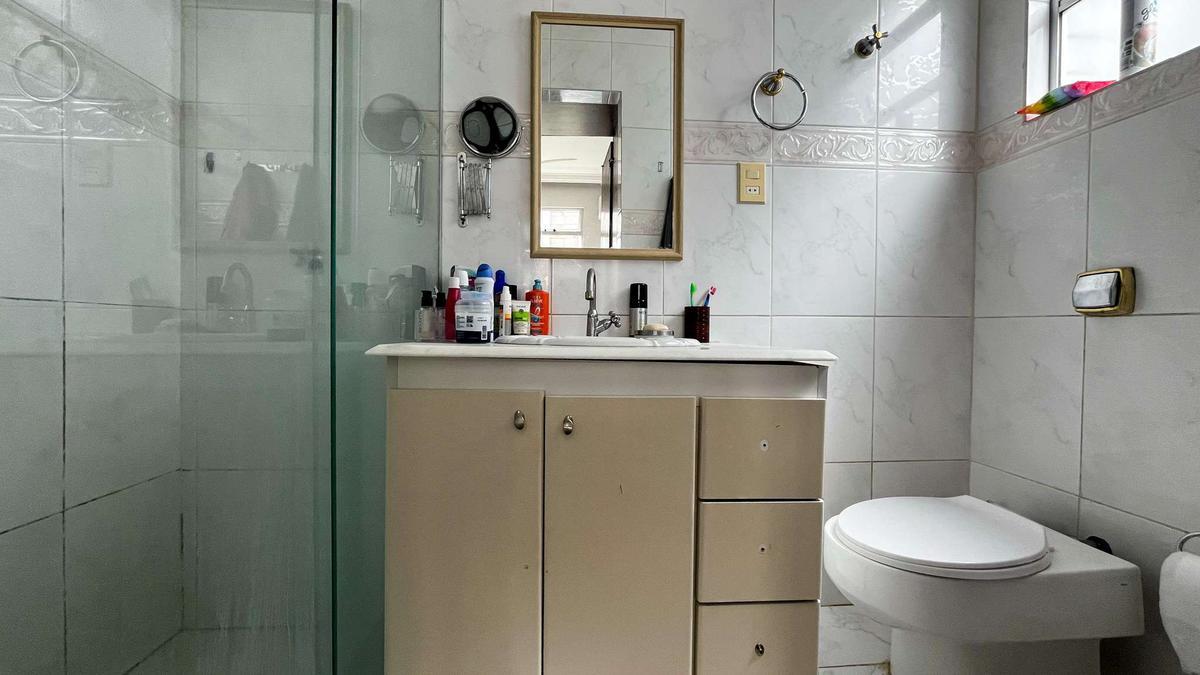 Banheiro Social: Com bancada em granito, armário, box em vidro temperado e espelho.