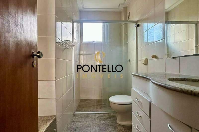 Banheiros das suítes com bancada em granito, armários, espelho e box em blindex.