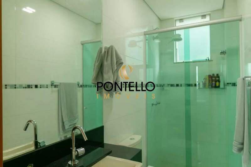 Banheiro social com bancada em granito, armários, espelho e box em blindex