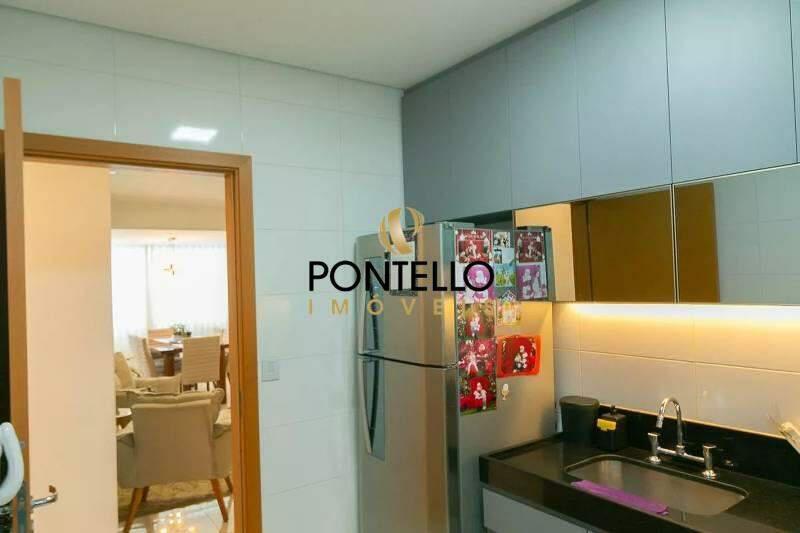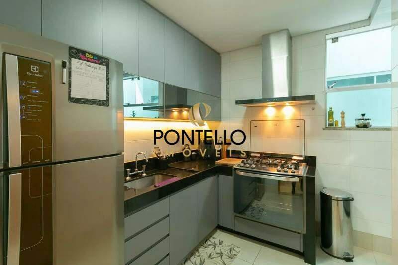 Cozinha com bancada em granito, piso em cerâmica, armários planejados e coifa