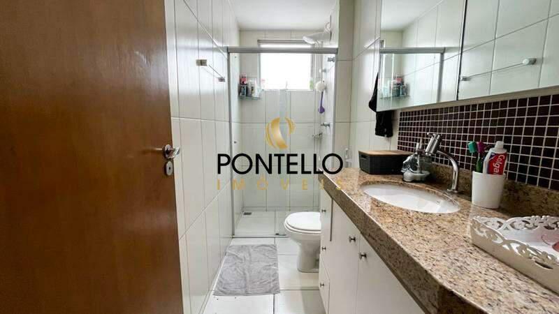 ¿ Banho da suíte com bancada em granito, armário, espelho e box em blindex.