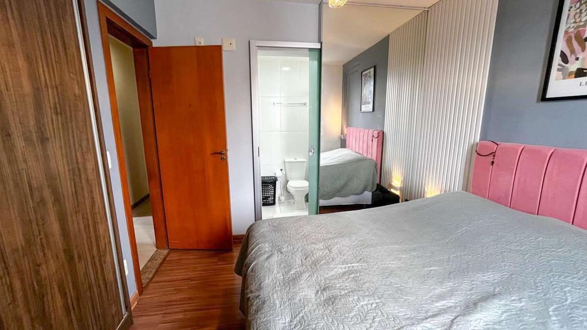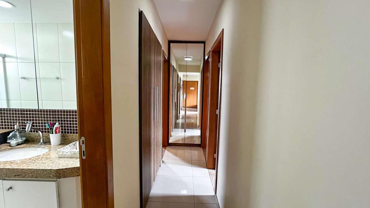 Banho da suíte com bancada em granito, armário, espelho e box em blindex.