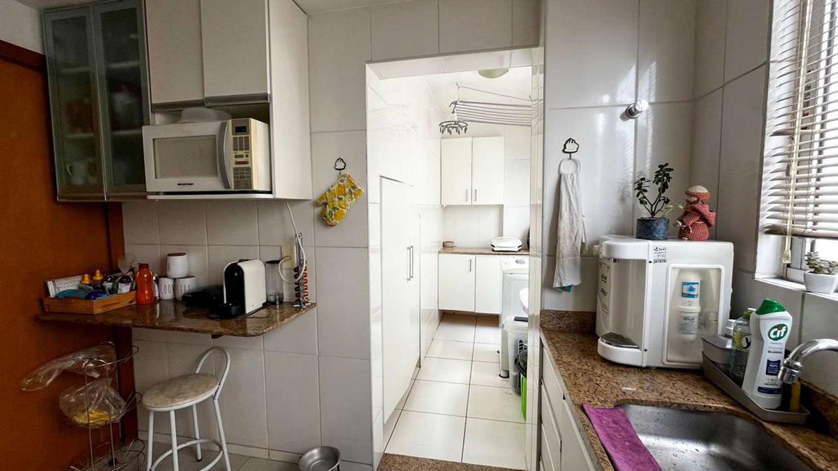 Cozinha com armários planejados e bancadas em granito, piso em porcelanato.