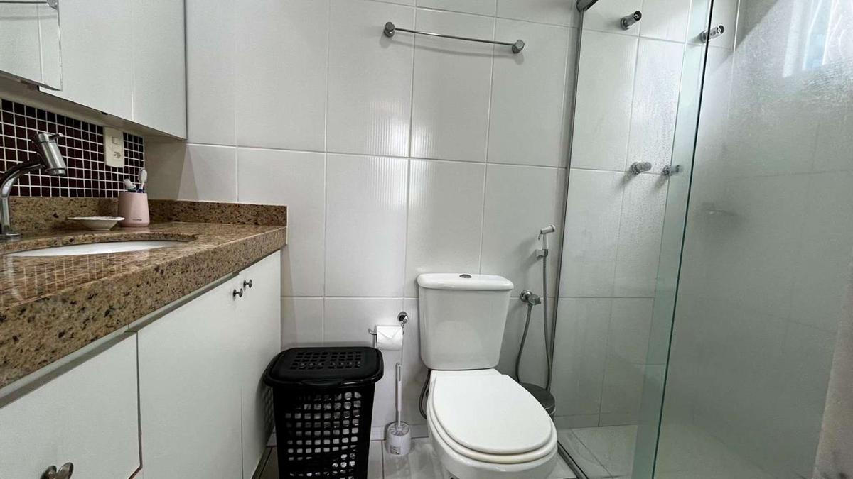 Banho social com bancada em granito, armário, espelho e box em blindex.