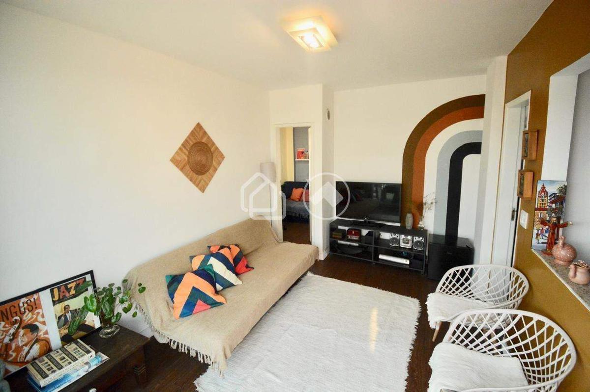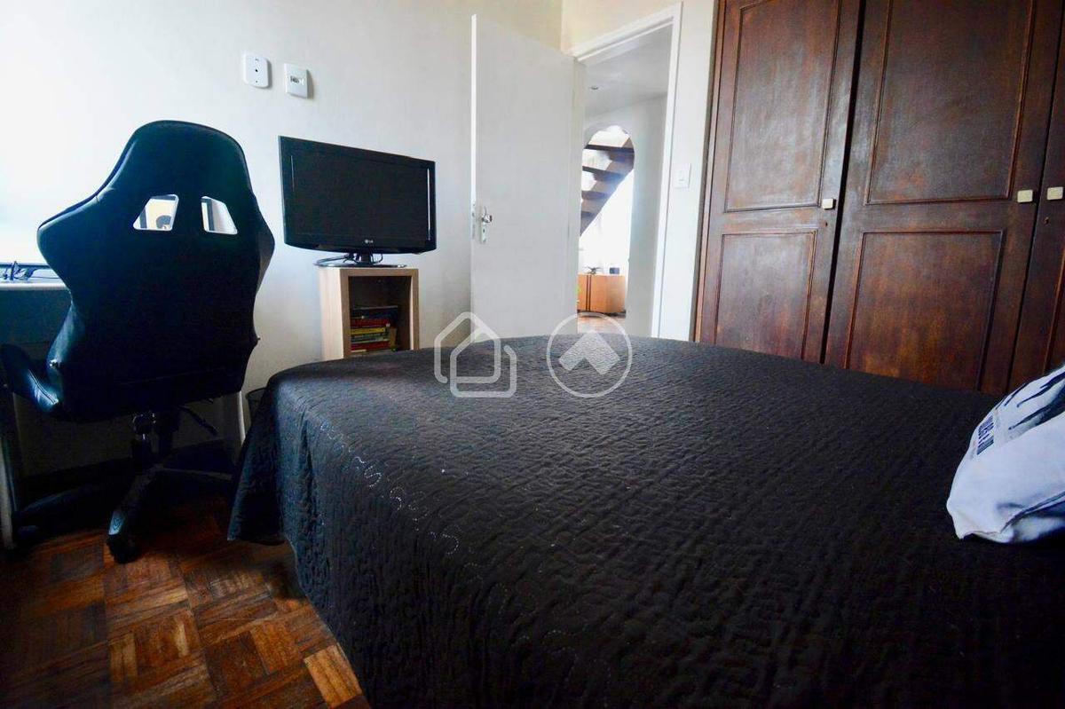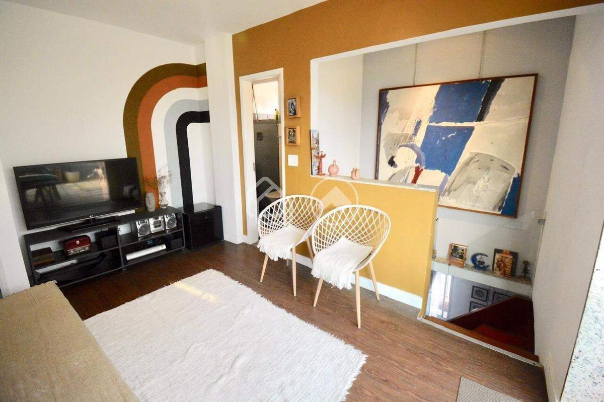 2 quartos, 1 banheiro social, cozinha com pequena área de serviço separada e sala para 2 ambientes com escada em peroba rosa e guarda corpo de vidro.