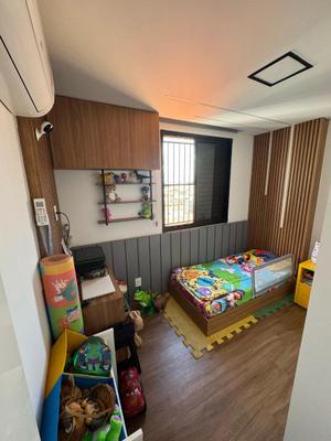 São 3 quartos com armários, sendo o quarto da suíte com closet, luz embutida, ar condicionado e teto rebaixado. Sala para dois ambientes com rebaixamento e luzes embutidas, lustres e painel para TV, também com ar condicionado. Cozinha planejada com coifa, rebaixamento em gesso, luz embutida, bancadas em mármore, fogão cooktop e piso em porcelanato.