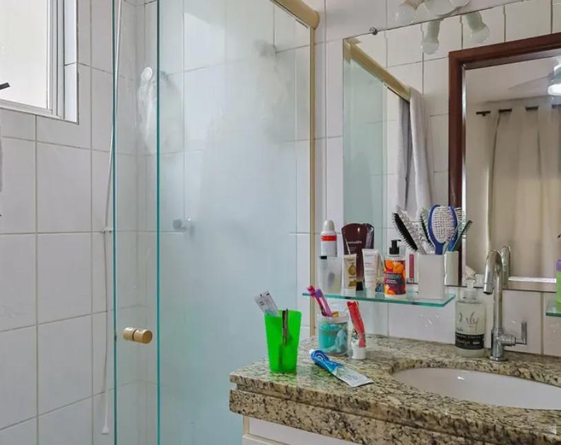 Banheiro social com bancada em granito, armário, espelho e box em blindex