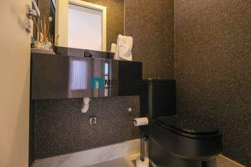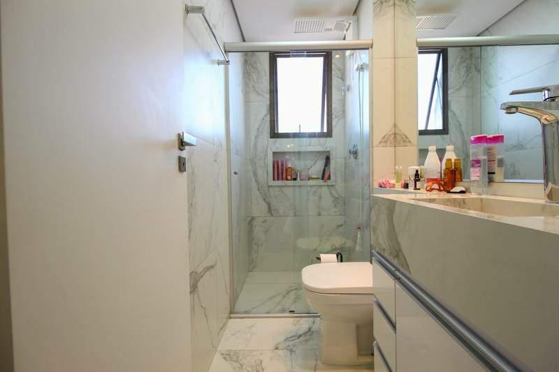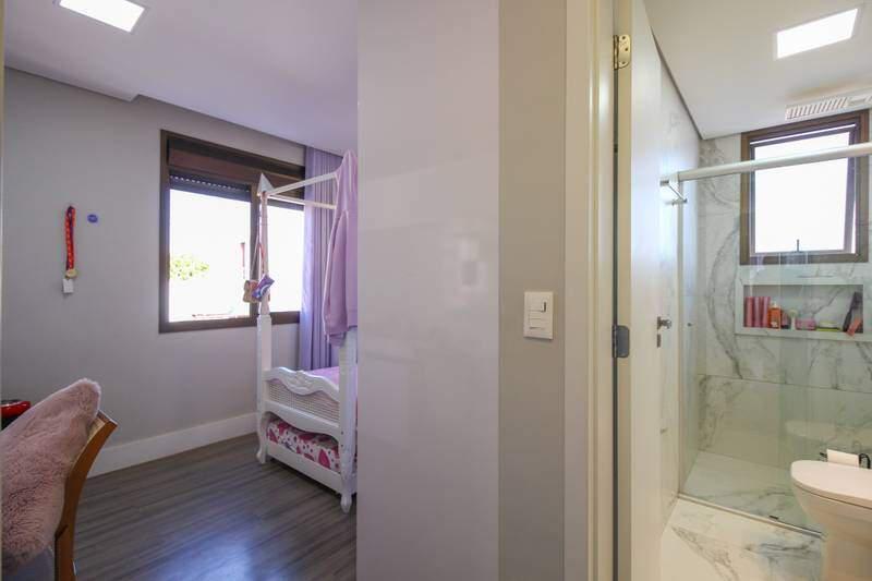 ¿ 3 quartos com armários planejados e piso laminado de madeira, sendo 2 suítes com bancada em porcelanato, armários planejados, espelho e box em blindex;