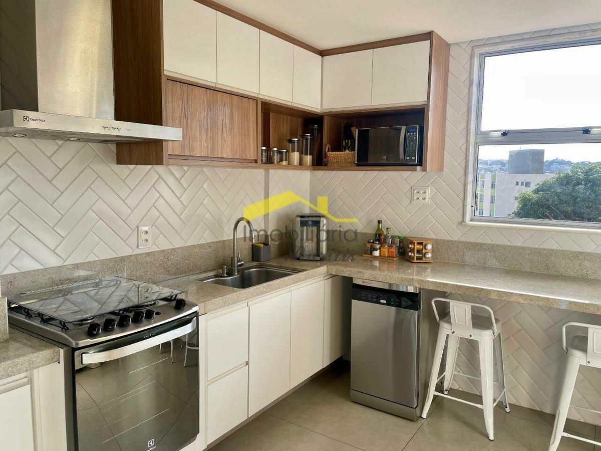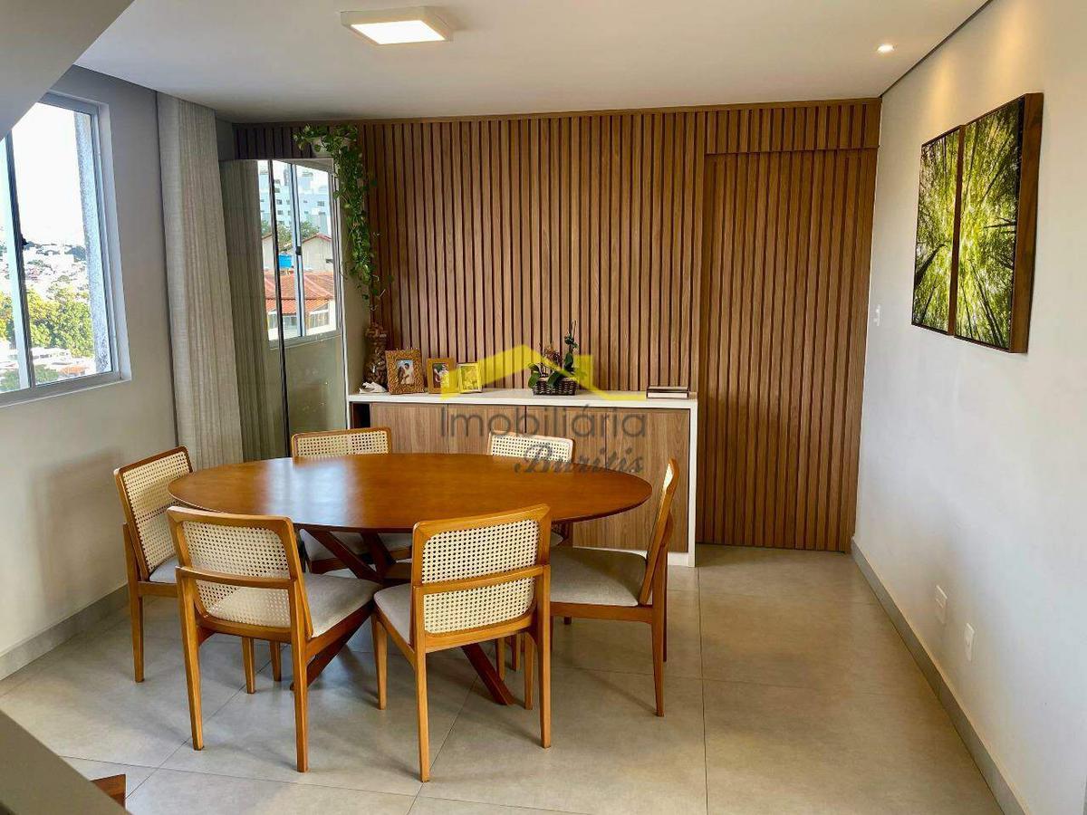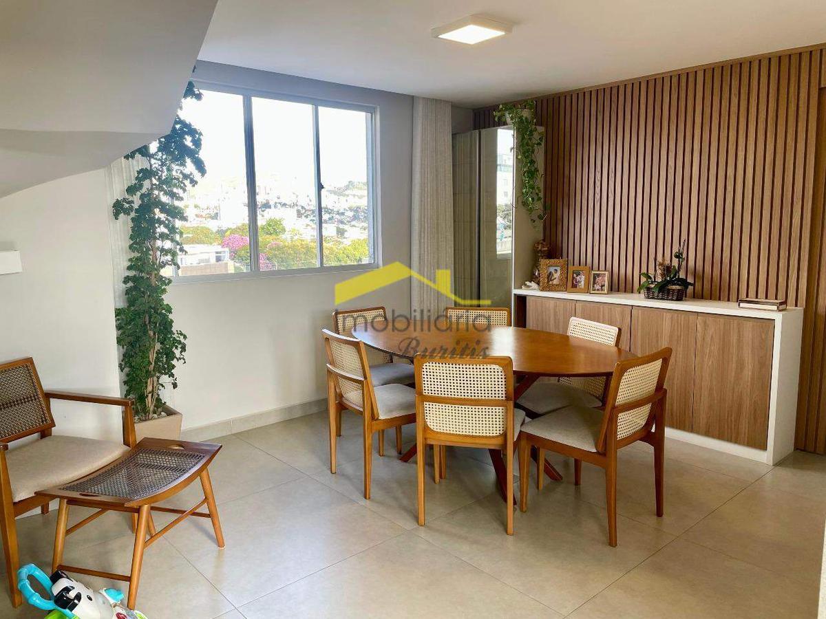 Cobertura duplex com 168 m², dividida em dois pavimentos. No primeiro piso, sala espaçosa com piso em porcelanato, janelas amplas em alumínio e vidro, com sol da manhã e vista definitiva. São três quartos com armários, sendo um adaptado como escritório, todos com piso laminado e venezianas. Suíte e banheiro social com bancadas em granito, armários e box em blindex.