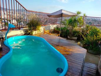 ¿ Piscina aquecida com deck de madeira e uma bela vista panorâmica.