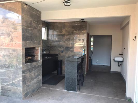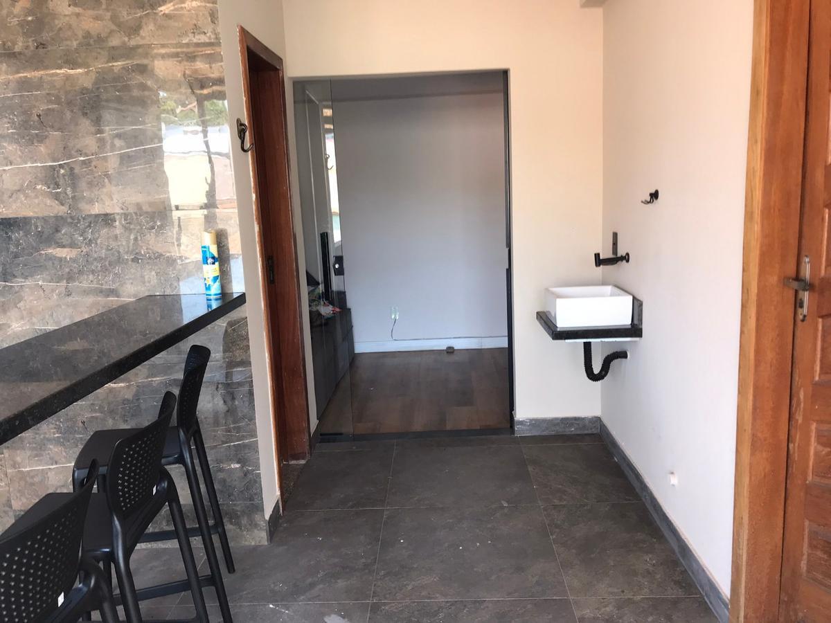 ?Área gourmet com churrasqueira, bancada, pia, pergolado e lavabo.