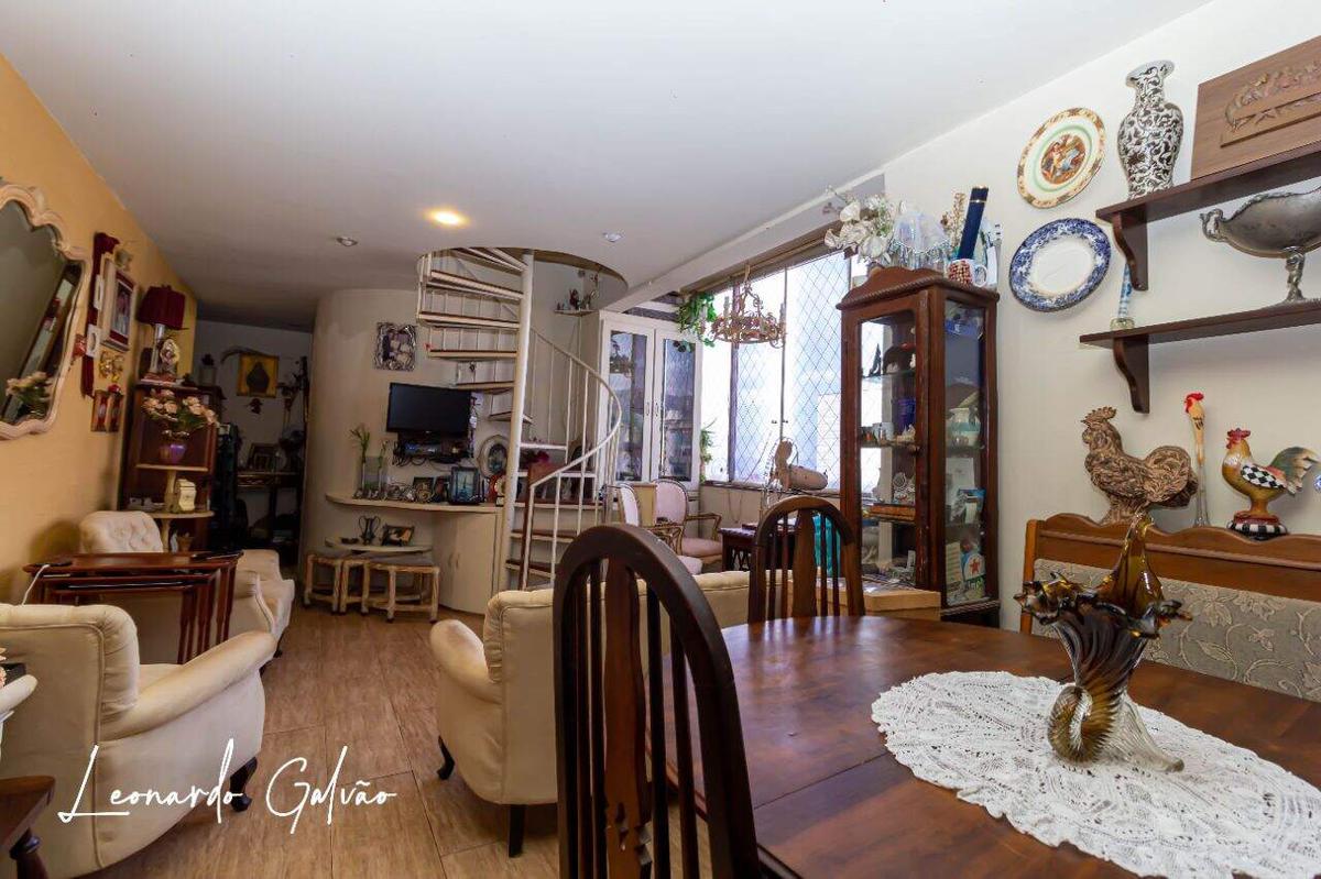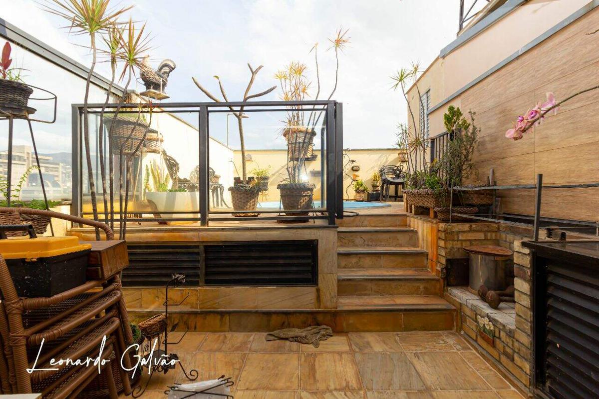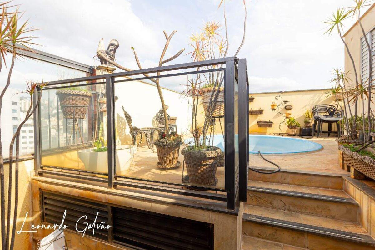 Cobertura com 3 quartos, primeiro nível com quarto e suite com armários, banho, cozinha, área de serviço independente, despensa, quarto de empregada com banheiro. Segundo nível com pequeno quarto, sala, lavabo, churrasqueira, atelier ou oficina de trabalho e piscina. Diferencial deste imóvel é a localização e a vista panorâmica. As 2 vagas são paralelas e cobertas. Prédio com elevadores, salão de festas, espaço kids, cftv, guarita, portão eletrônico, gás canalizado e poço artesiano, que possibilita condomínio econômico.