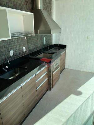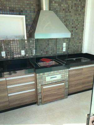 Espaço gourmet com churrasqueira embutida, bancada em granito nobre, armários planejados e uma varanda ampla para receber amigos e família;