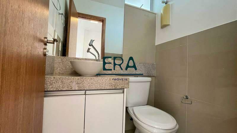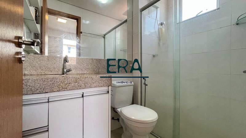 Banheiro social com armários planejados, espelho e box em blindex