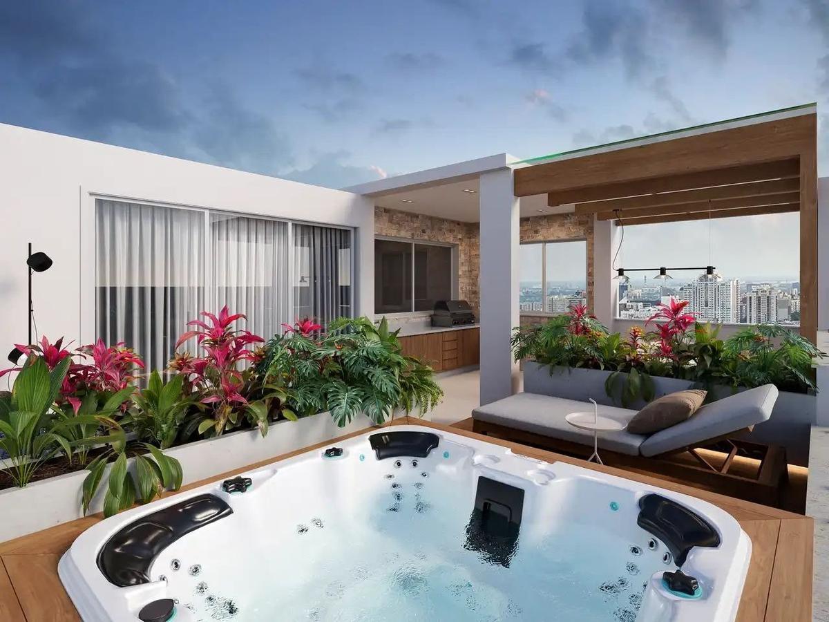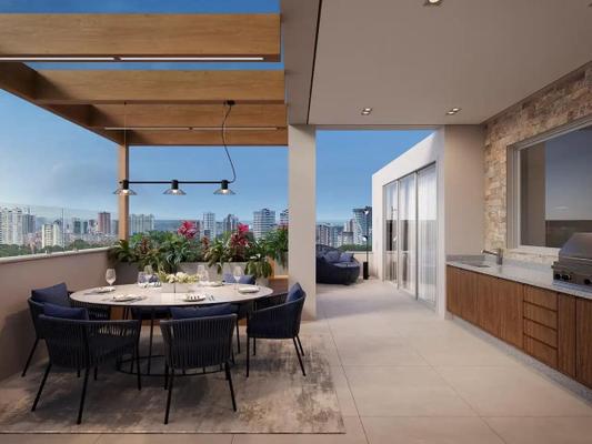 Apartamento com 103m² de área interna primero pavimento com sala de estar e jantar no mesmo ambiente, lavabo, cozinha, área de serviço com banheiro de empregada, terraço descoberto com 49m² e segundo pavimento três quartos sendo uma suíte master com closet e terraço descoberto, banheiro social e duas vagas de garagem.