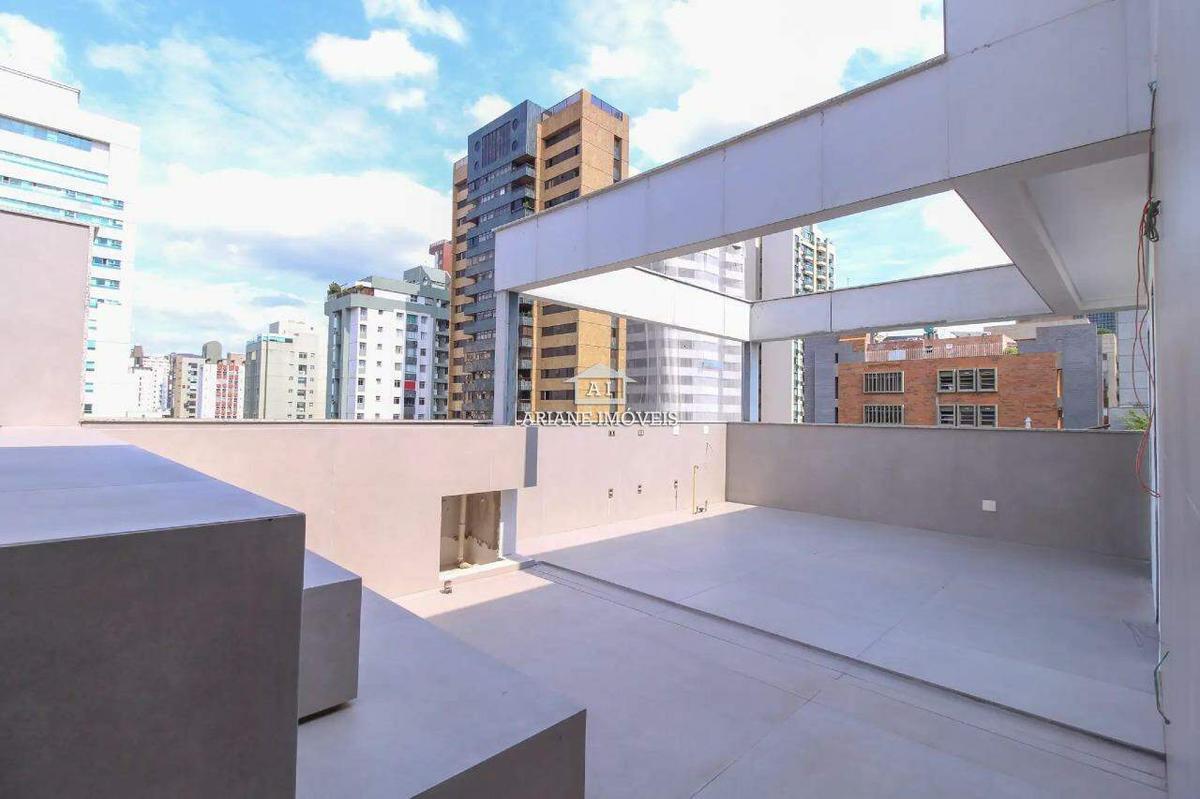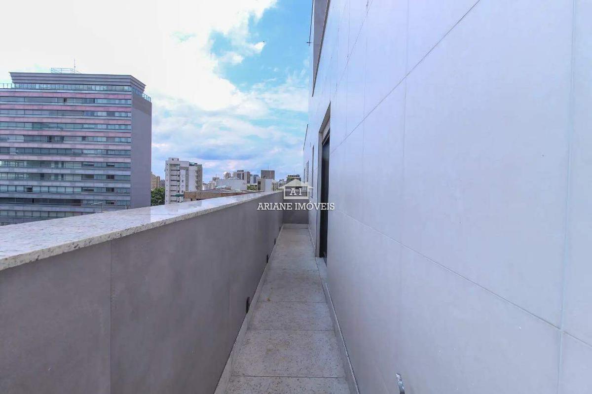 Esta magnífica cobertura na Savassi, com 214m², oferece 3 suítes e 3 vagas de garagem (uma livre e duas em linha).