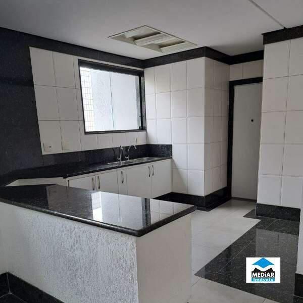 Cozinha espaçosa com piso em granito, bancada americana armários planejados e pia em granito
