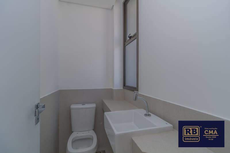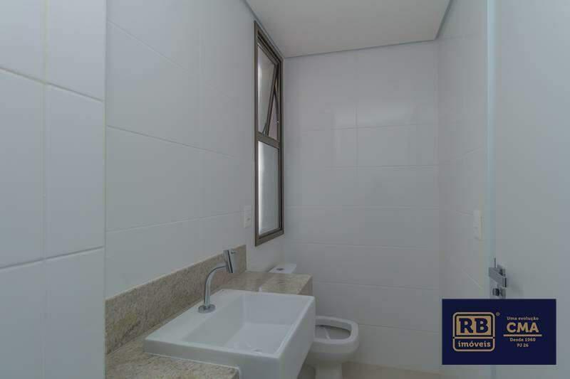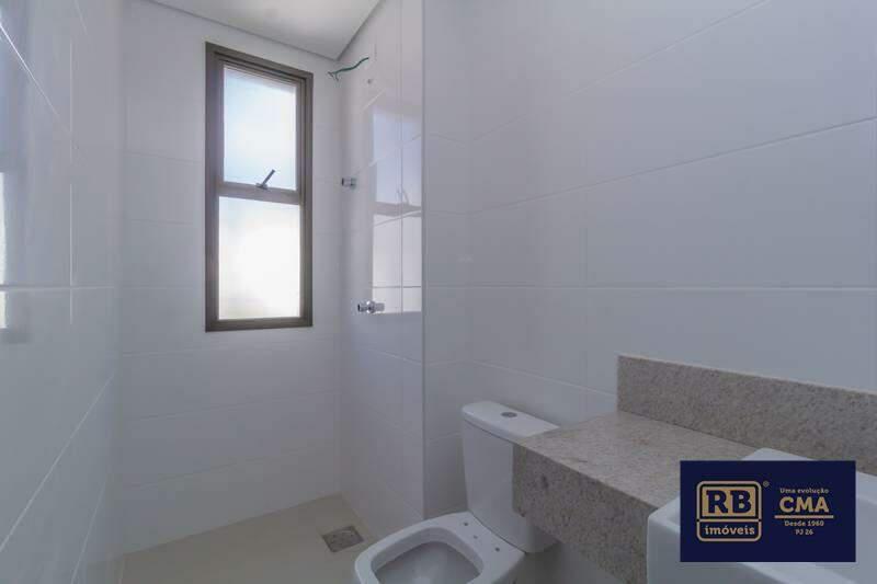 Banheiros (suíte e social) com ventilação natural e acabamento em porcelanato.