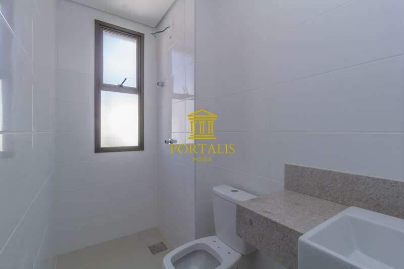 Banheiros (suíte e social) com ventilação natural e acabamento em porcelanato.