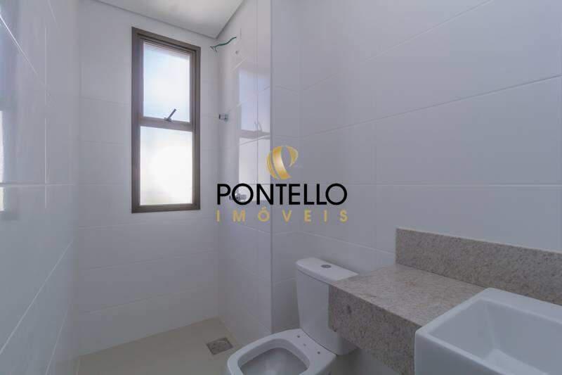 Banheiros (suíte e social) com ventilação natural e acabamento em porcelanato.