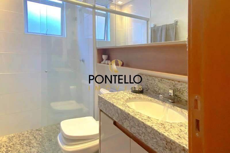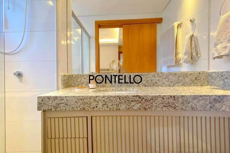 Banheiros (social e suíte) com piso e bancadas em granito, box em vidro temperado (blindex), armários, espelhos e iluminação planejada.