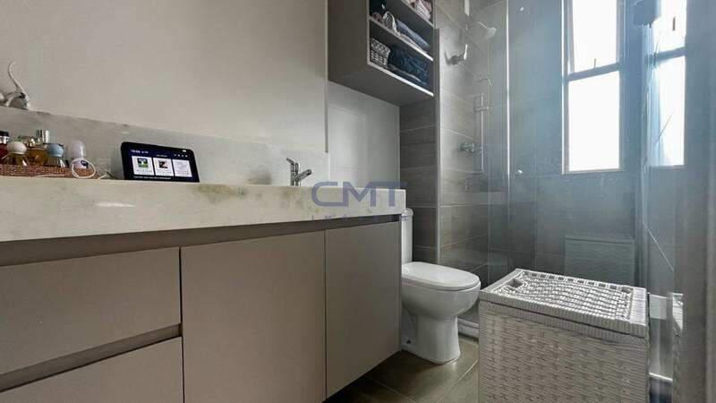 ¿ 03 quartos com armários planejados, iluminação personalizada e piso laminado de madeira, sendo 02 suítes com armário, bancadas em mármore, piso em porcelanato e box blindex.