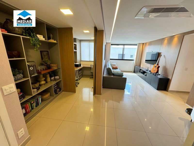 01º Pavimento: Ampla sala para 02 ambientes com rebaixamento em gesso, iluminação planejada, painel em MDF e piso em porcelanato, escritório montado com armários, banho social com bancada em granito, armário, espelho e box em blindex e 03 quartos amplos com armários planejados, ar-condicionado, piso em laminado de madeira e janelas em venezianas integradas automatizada, sendo 01 suíte, banho da suíte com bancada em granito, armário, espelho e box em blindex.