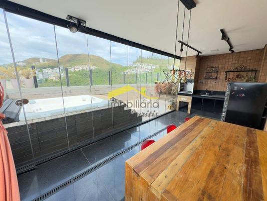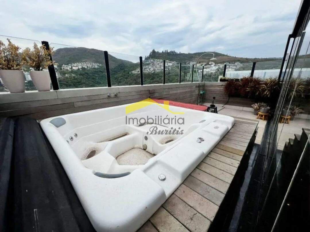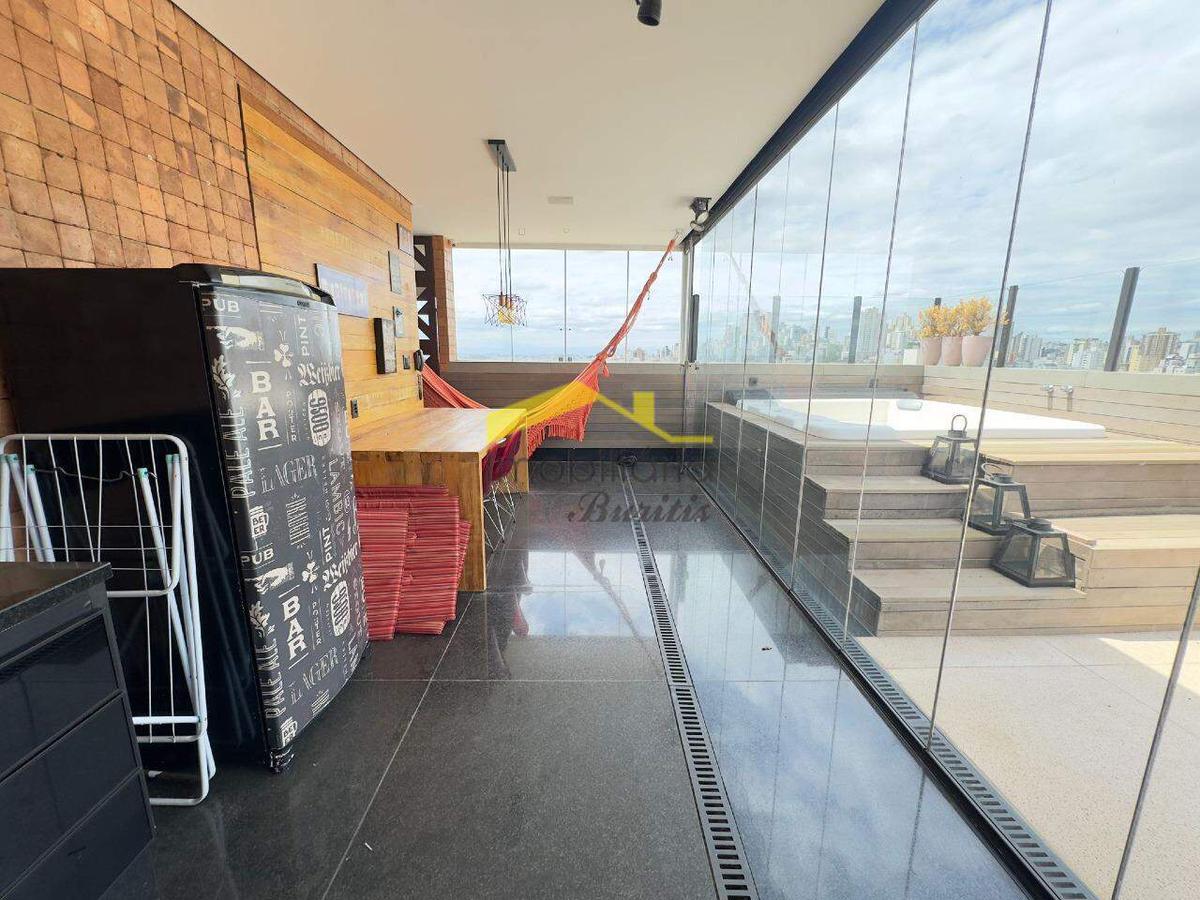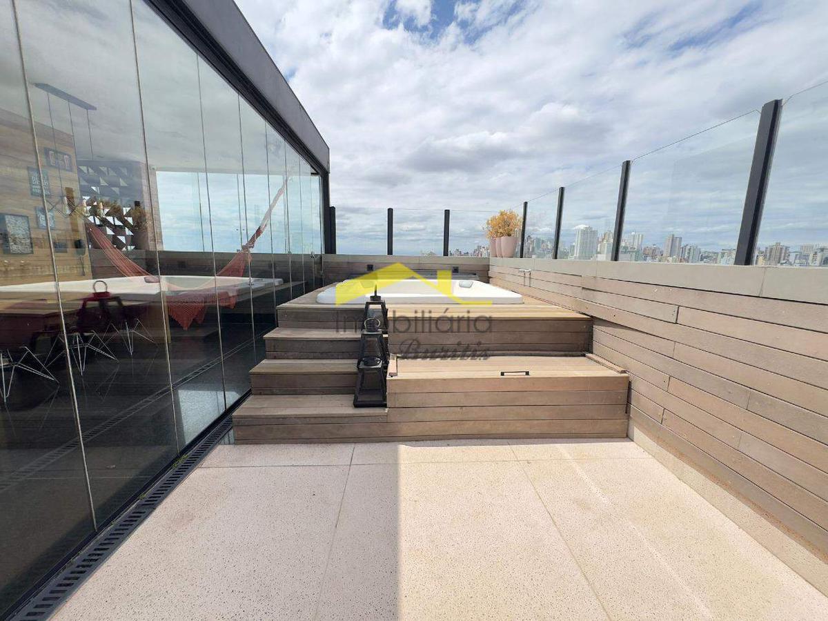 Área externa com espaço gourmet completo, churrasqueira, hidromassagem e vista definitiva.