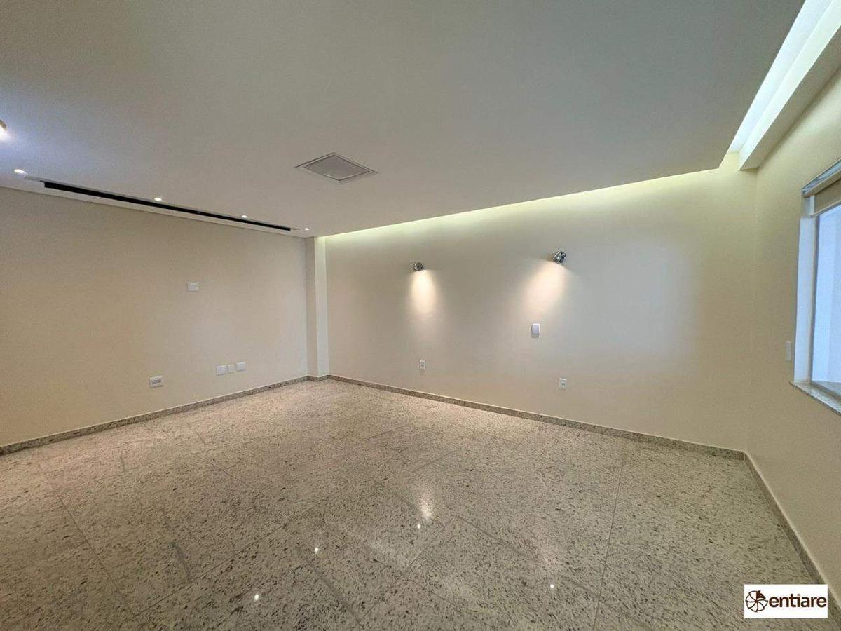 Sala de TV ampla, com painéis planejados e sistema de som instalado;