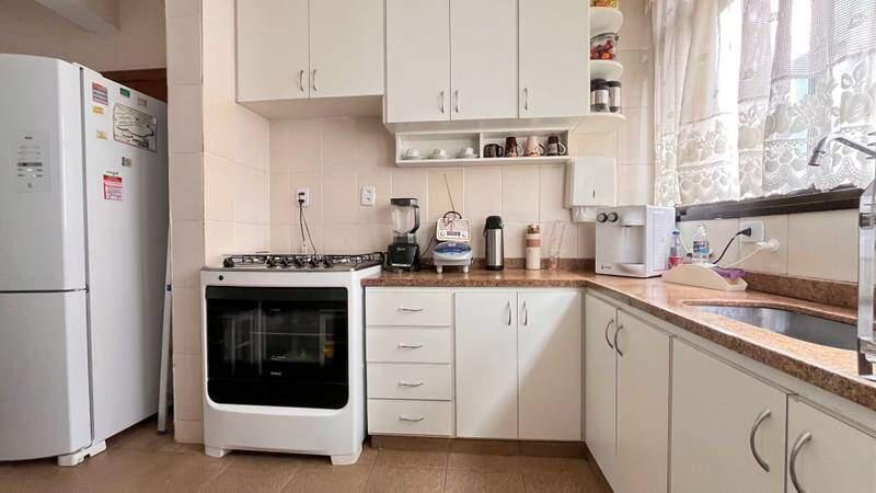 ¿ Cozinha funcional com piso em cerâmica, bancada em granito e armários planejados.